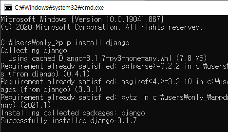 설치 완료 후 우선 명령 프롬프트(윈도우+R -> cmd검색)를 열어 django를 설치해준다.