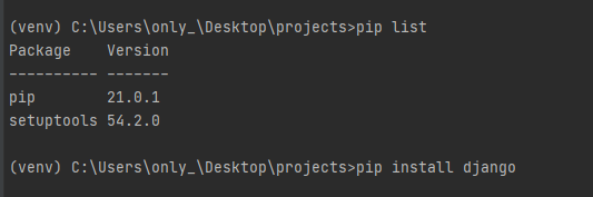새로운 환경이기 때문에 pip list로 확인해보면 django를 포함하여 설치된 패키지가 없다. 따라서 위에 설명한대로 django 패키지를 다시 한번 설치해준다.