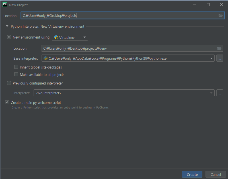 다른 것은 그대로 두고 경로만 설정해준다. 나는 기존에 프로젝트들 넣어 놓는 폴더로 설정했다.