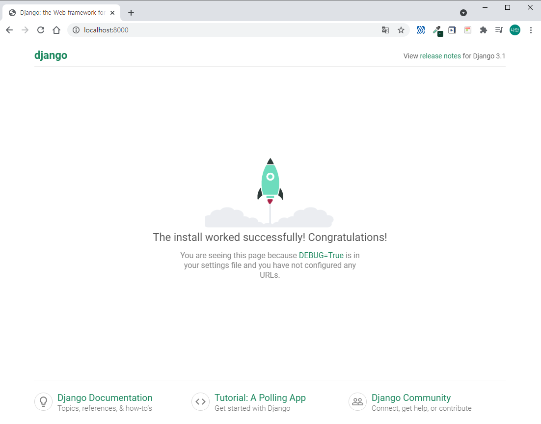 브라우저에 localhost:8000 또는 127.0.0.1:8000을 입력해 로컬 페이지가 나오면 django 기본 세팅이 완료되었다.