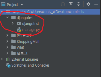 프로젝트 내에는 프로젝트명으로 된 폴더와 manage.py 파일이 있다.