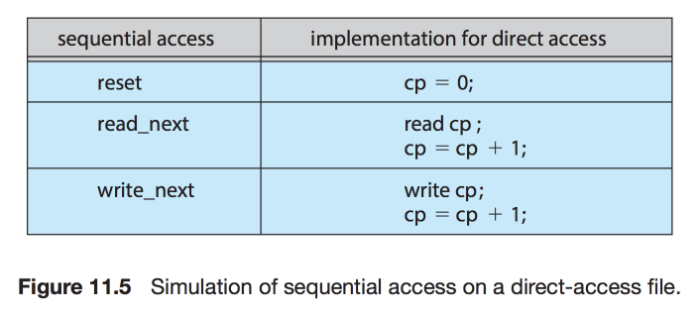 기본적인 접근 방법으로 file pointer를 따라 파일 정보가 차례차례 처리된다. read(), write()는 자동으로 file pointer를 변경시키고 lseek()를 사용해 file pointer를 조정할 수 있다.
