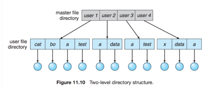 사용자별로 디렉터리를 생성한 구조. MFD(Master File Directory)가 있고 그 아래에 사용자별로 할당되는 UFD(User File Directory)가 있다. 파일 참조 시 각 UFD만 탐색하므로 사용자별로 파일 이름이 중복될 수 있다.