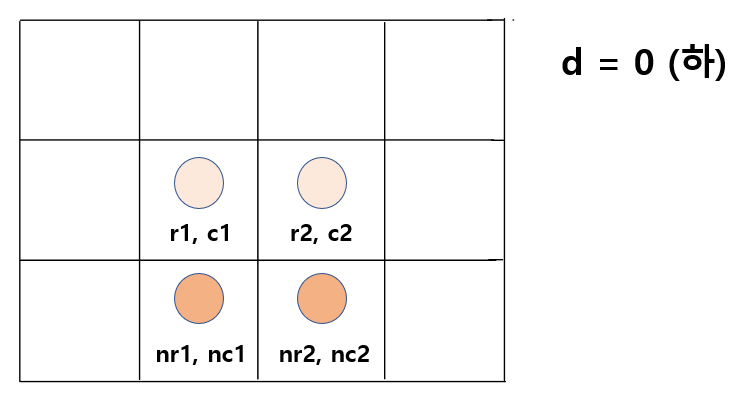 예를 들어 현재 좌표가 (r1, c1), (r2, c2), 로봇의 타입이 가로(0)이고, 탐색 방향 d = 0, 1(하, 상)일 때 아래 3가지 경우가 가능하다.