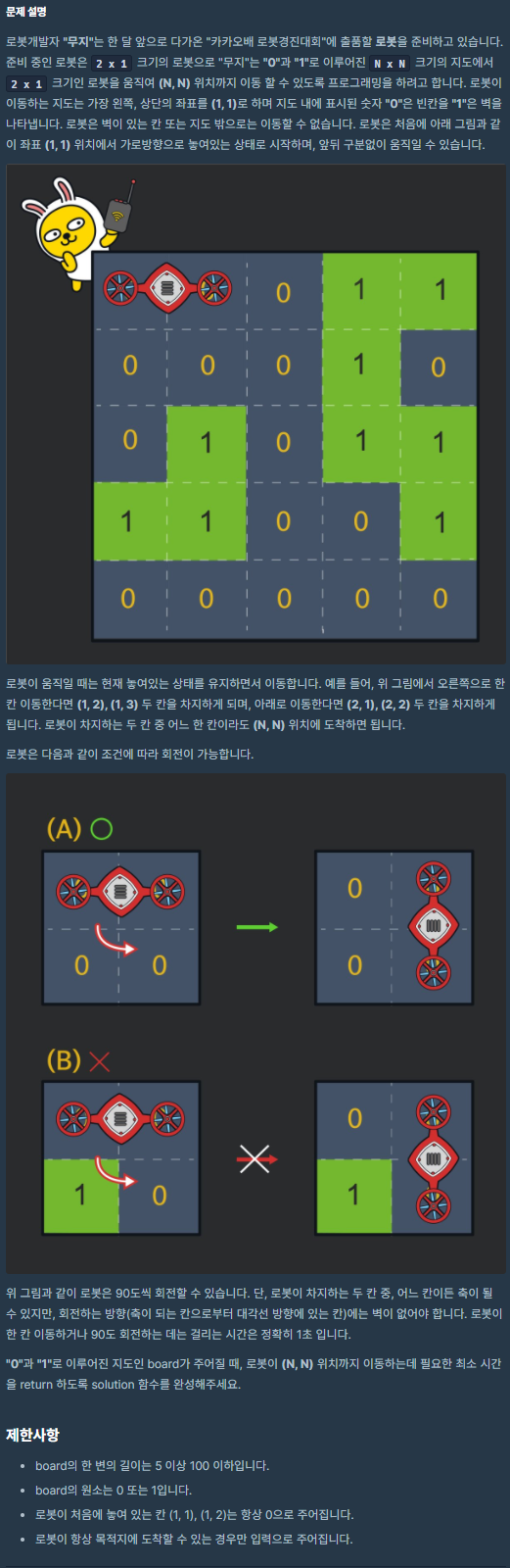 또한 로봇은 가로 or 세로 타입을 가지기 때문에 방문탐색은 3차원 배열 boolean[2][][]을 통해 관리하였다. visited 배열에서 각 타입별로 체크할 때 두 좌표가 모두 방문을 했을 때만 방문했었다고 판단하고, 하나라도 방문하지 않은 점을 가지면 진행할 수 있다.