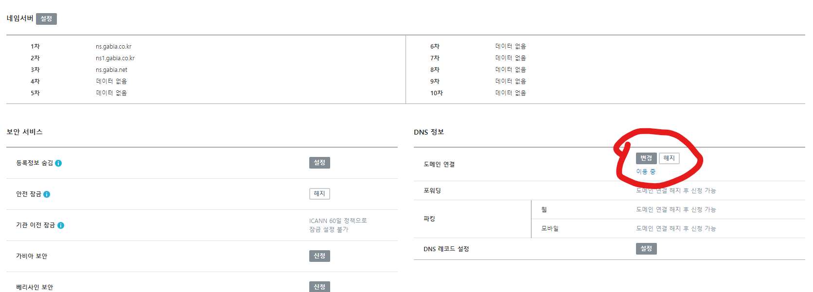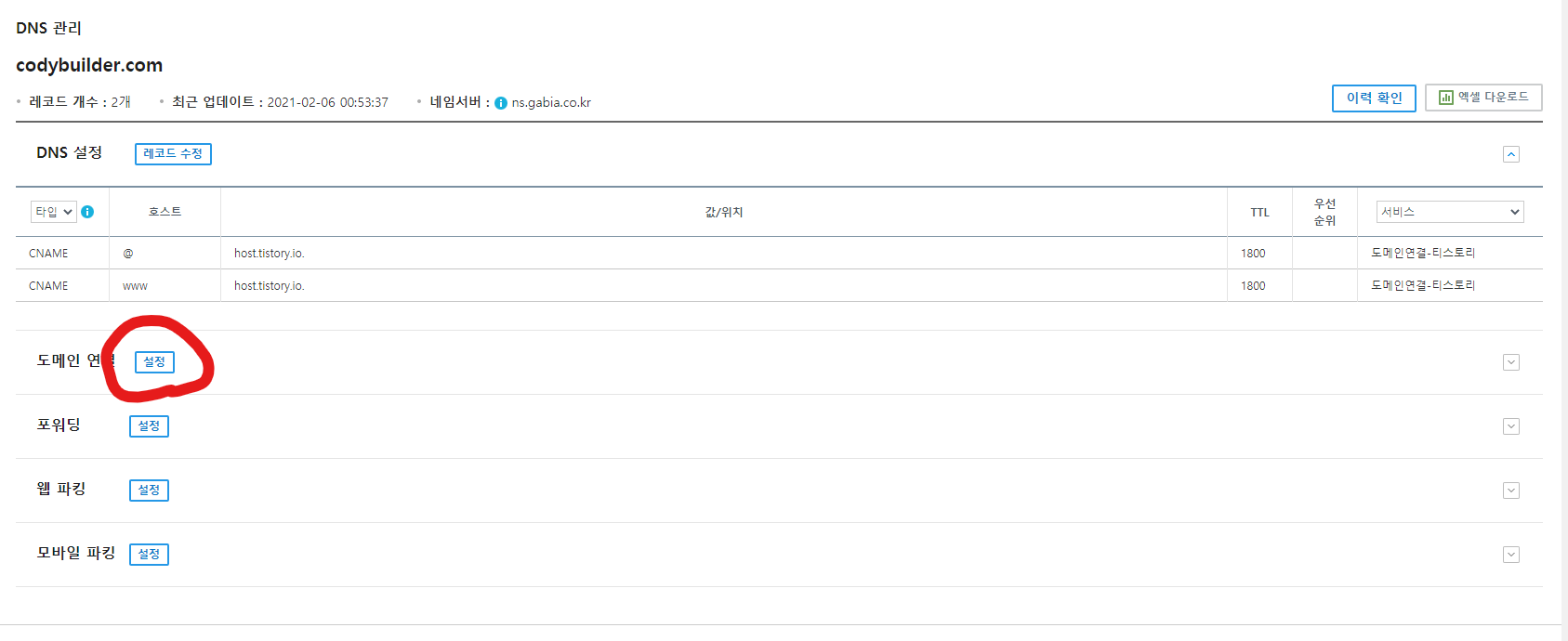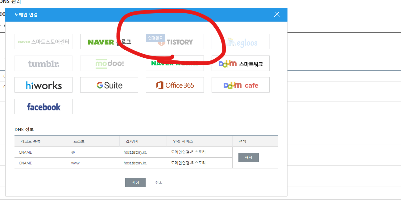다시 설정으로 들어가서 티스토리를 선택하면 가비아에서의 설정은 끝이다.