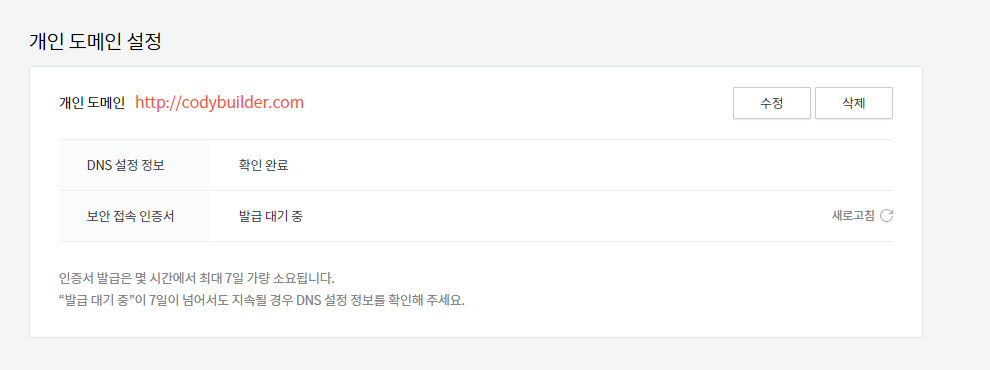 인증서 발급은 5분정도 걸리고 완료되면 잘 적용되는 것을 확인할 수 있다.