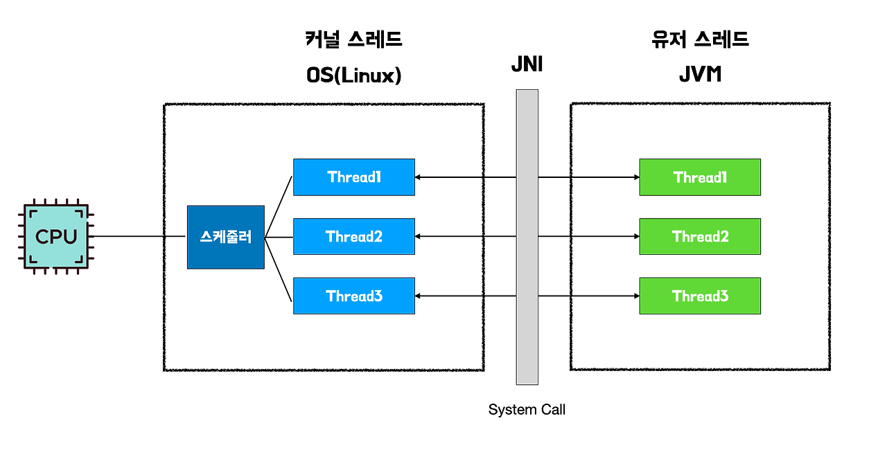 - OS에서 제공하는 커널 스레드를 1:1 wrapping해서 사용(Platform thread)