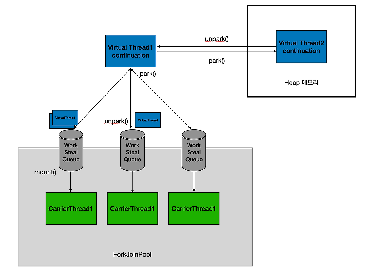 - ForkJoinPool을 통해 CarrierThread(기존 PlatformThread) 관리